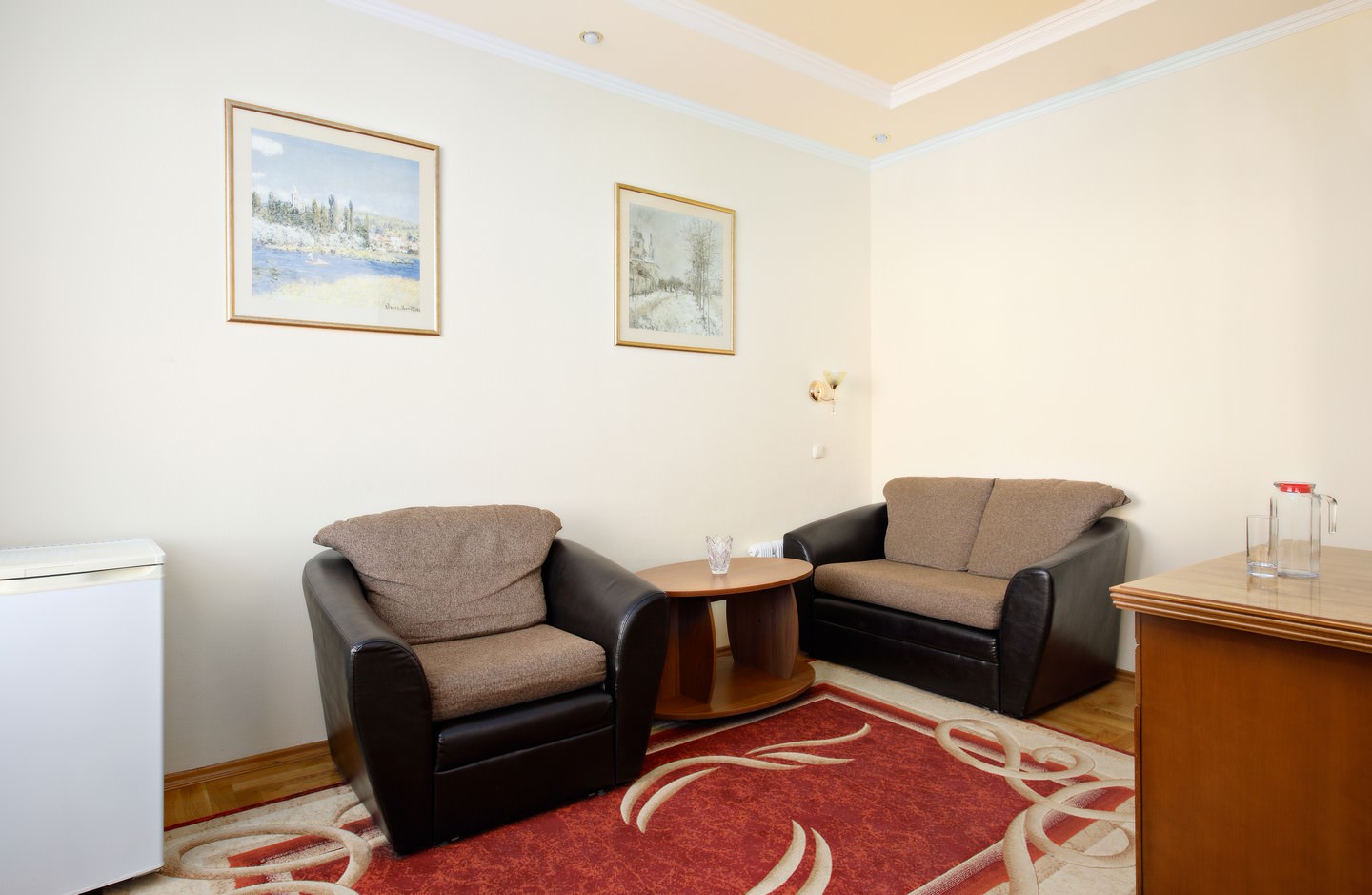 Номер оборудован двуспальной кроватью и мягкой мебелью.