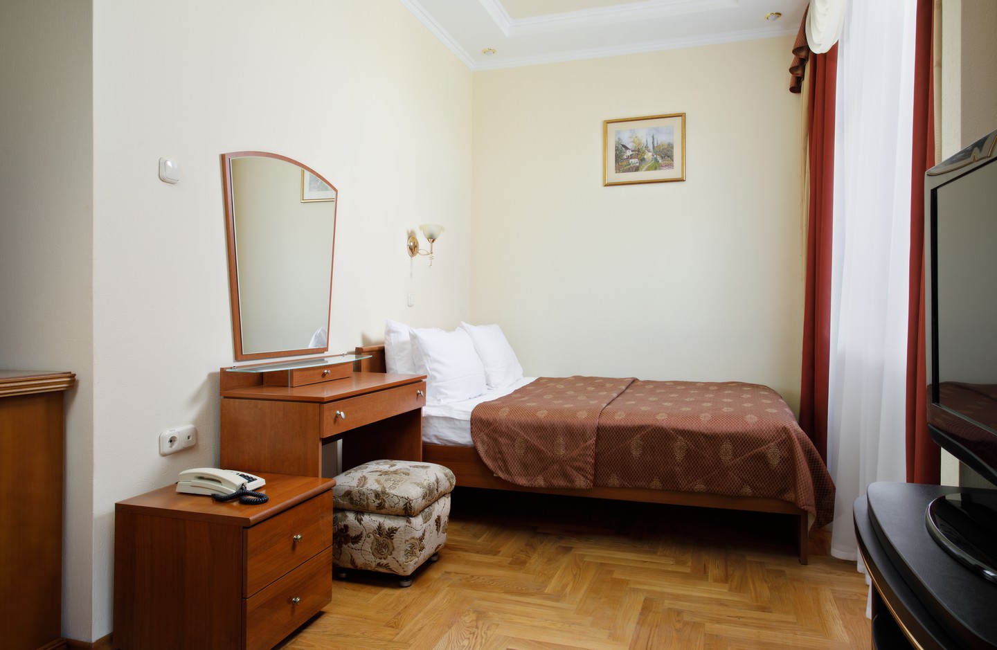 Имеются: телевизор, кабельные каналы телевидения, wi-fi, магнитная ключ-карточка, холодильник, телефон, сейф, электрический чайник, мини-бар