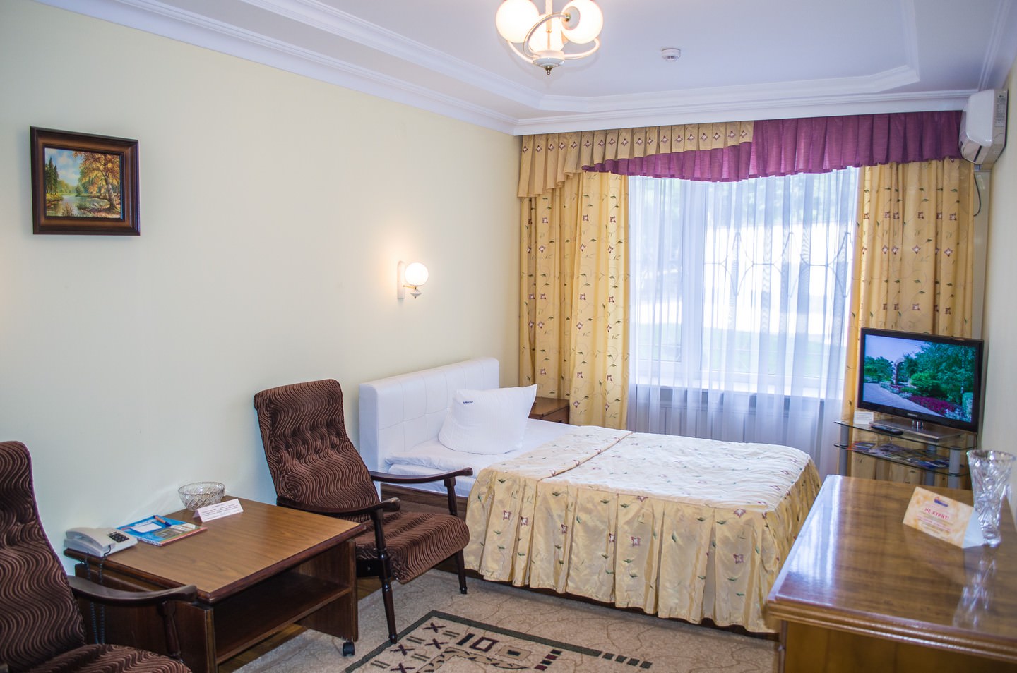 Номер площадью 61 кв.м оборудован одной полутороспальной кроватью.